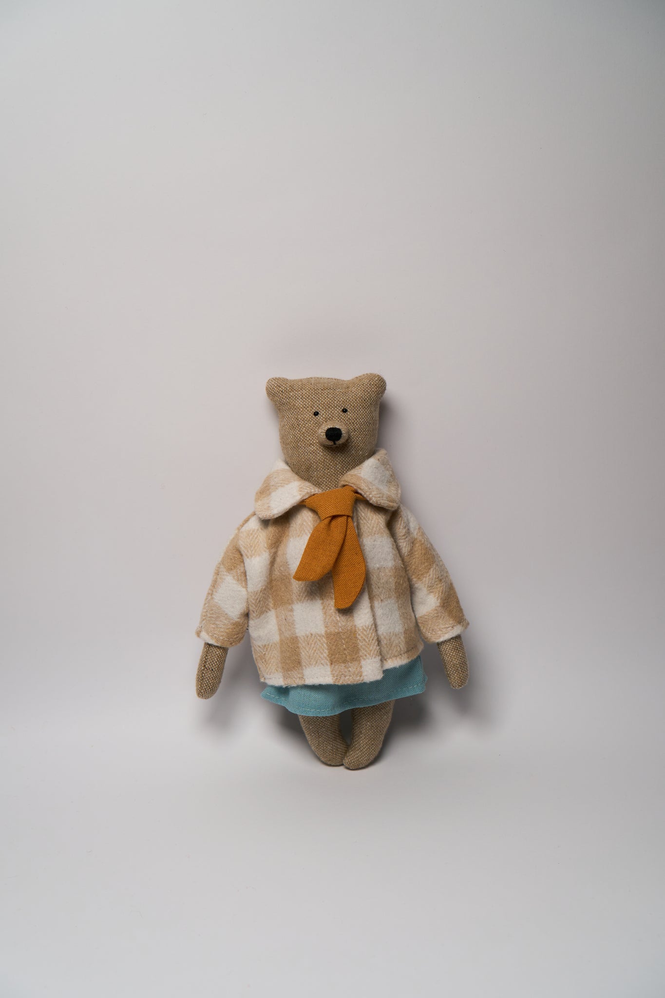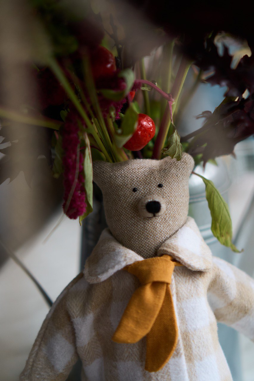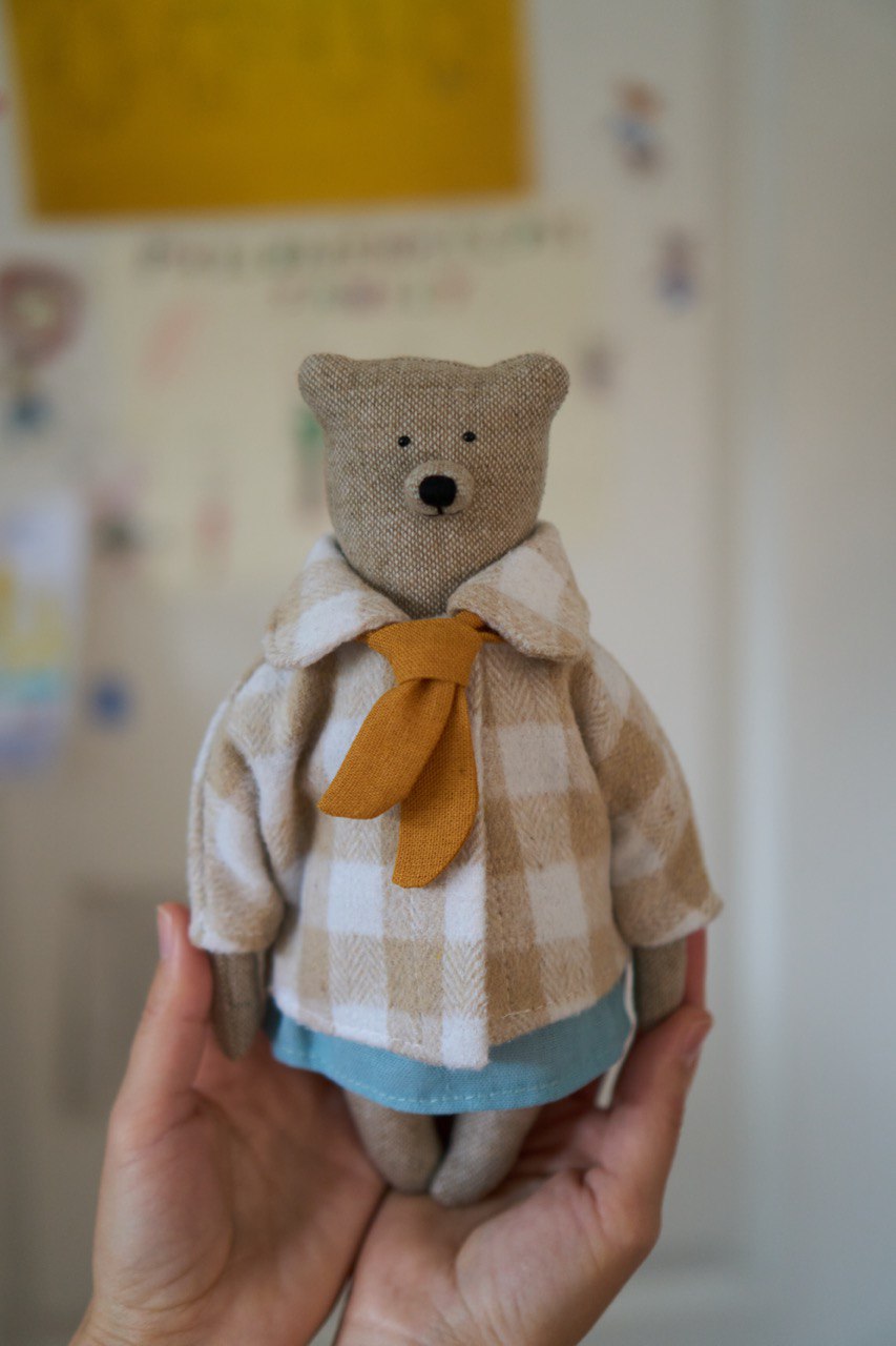 Маленька ведмедиця у льняній спідниці, жовтенькій футболці та м'якому пальті з акцентом у вигляді гірчичного шалика.