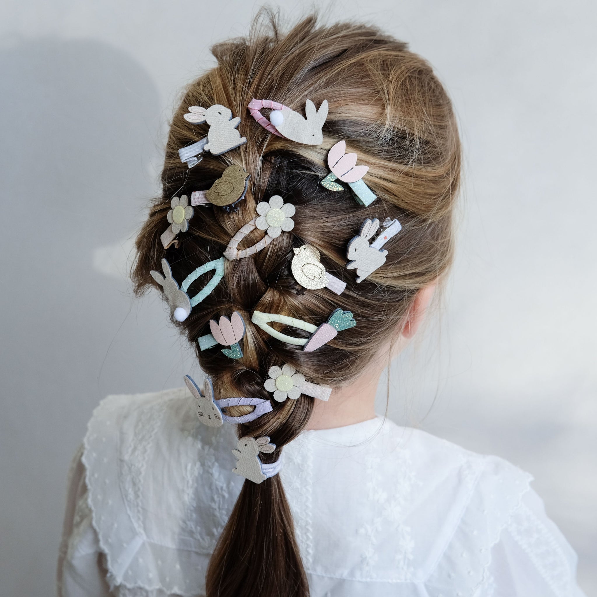 Кролики, морквина та ромашки, виготовлені з ніжного поєднання м’якої замші та блискучих тканин з пухнастими маленькими хвостиками-помпонами!