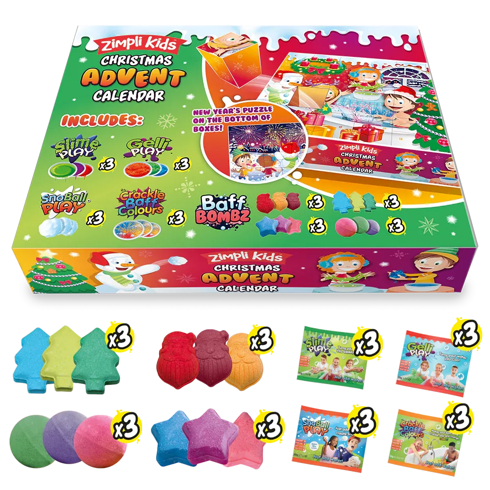 Адвент календар включає : Baff Bombz, Gelli Play, Slime Play, Crackle Baff і SnoPlay.