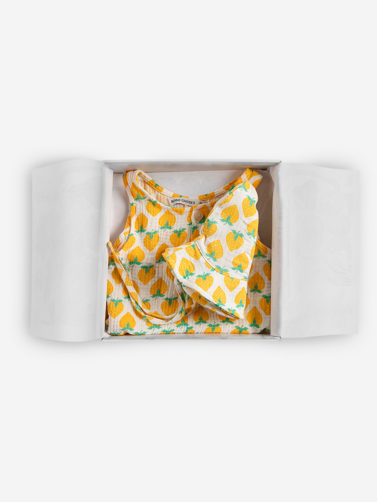 Жовтий комплект в подарунковій коробці. Боді без рукавів, застібка на ґудзиках спереду, застібка на кнопках між ногами, вишивка, вільний крій, короткий, структурована тканина та широкі бретелі. Панама на завʼязках. Вироблено в Іспанії.
