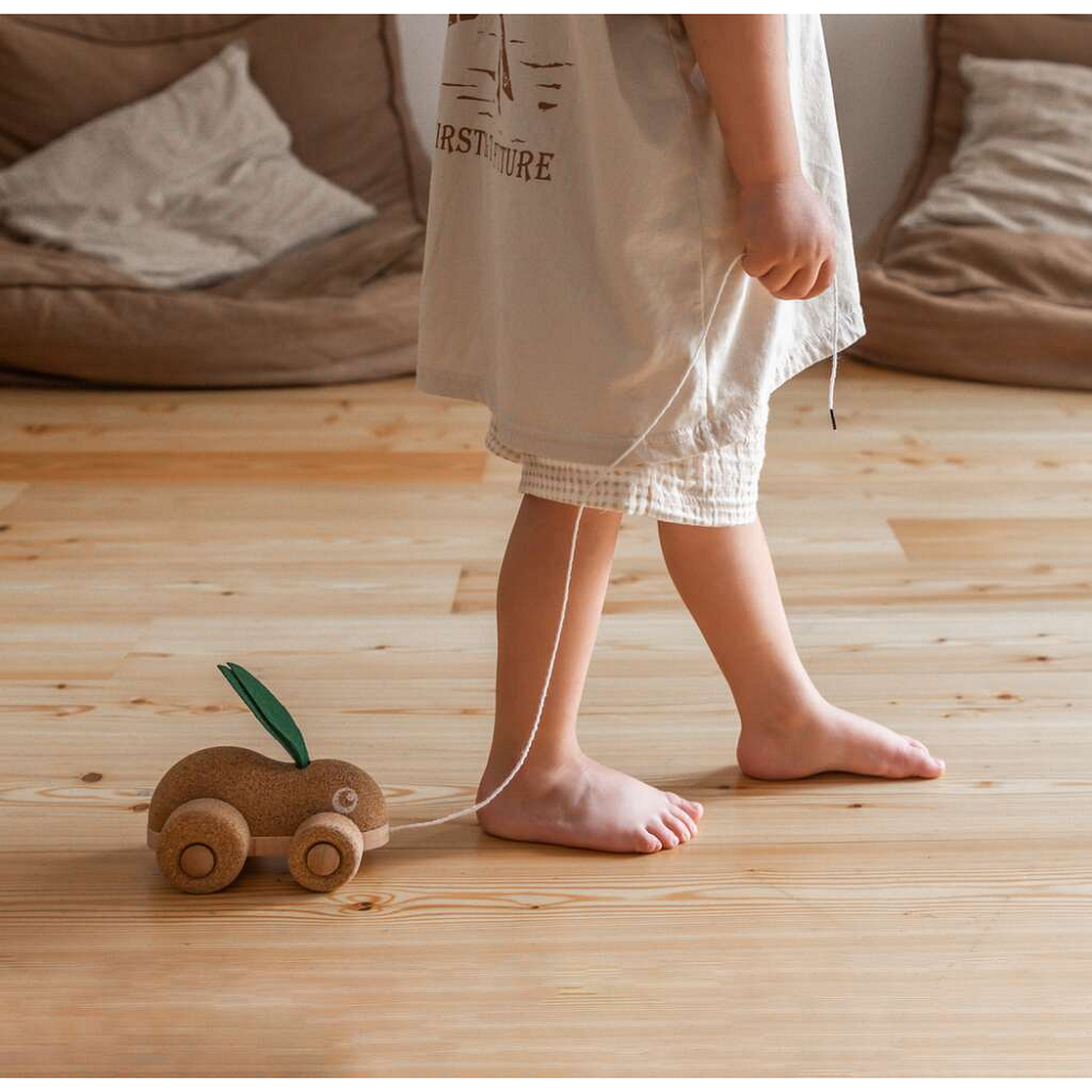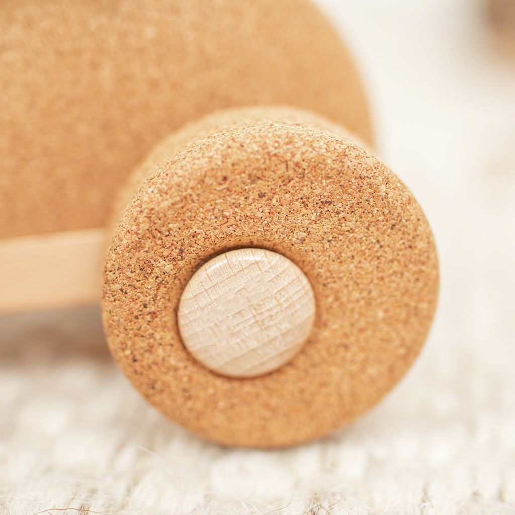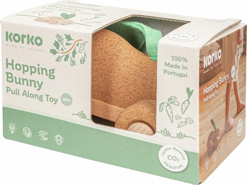(з 18 місяців) виконана з натуральної пробки й деревини. Стилізовану фігурку зайця прикрашають мʼякі вуха з фетру зеленого кольору. Колеса з пробки не дряпають підлогу — іграшка котиться максимально тихо.