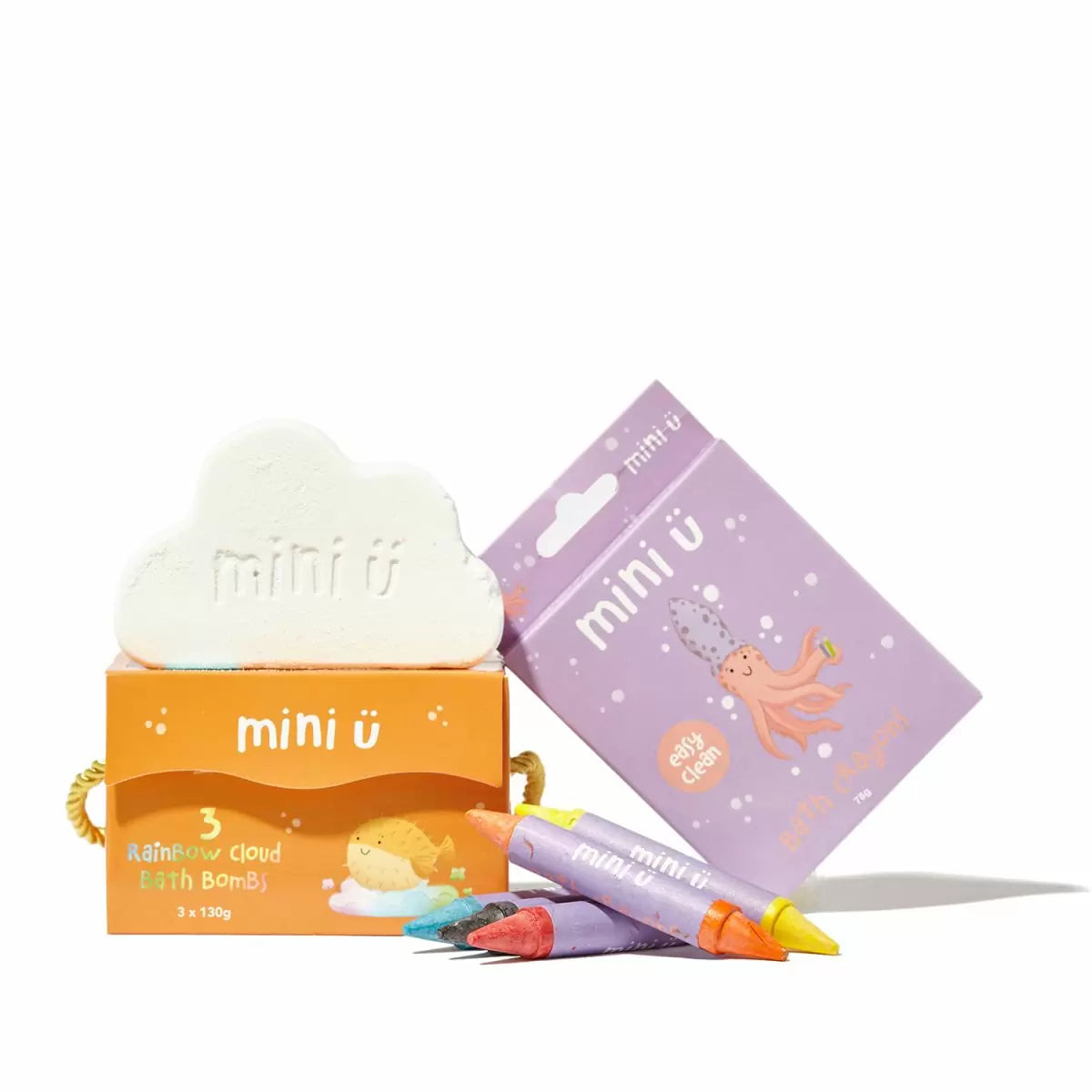 Подарунковий набір містить олівці для ванни Mini U, і Набір бомбочок для ванни, що змінюють колір води, для фантастично барвистого купання. Ідеальний подарунок для дітей у будь-яку пору року!