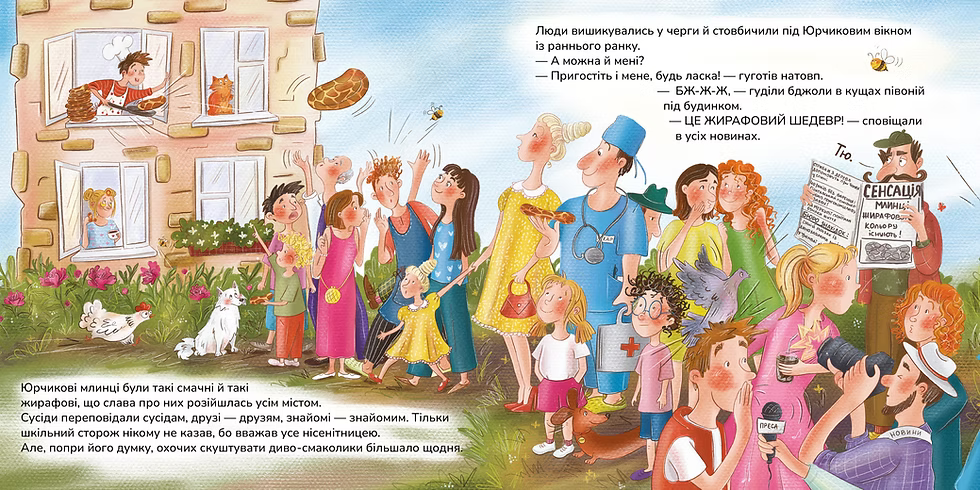 І найліпше йому вдаються млинці... жирафового кольору! Поголос про них ширився світом і досяг далекої спекотної Африки. Чи зʼясують справжні жирафи, у чому секрет популярності таємничих Юрчикових млинців? Дізнаймося разом на сторінках цієї захопливої історії!