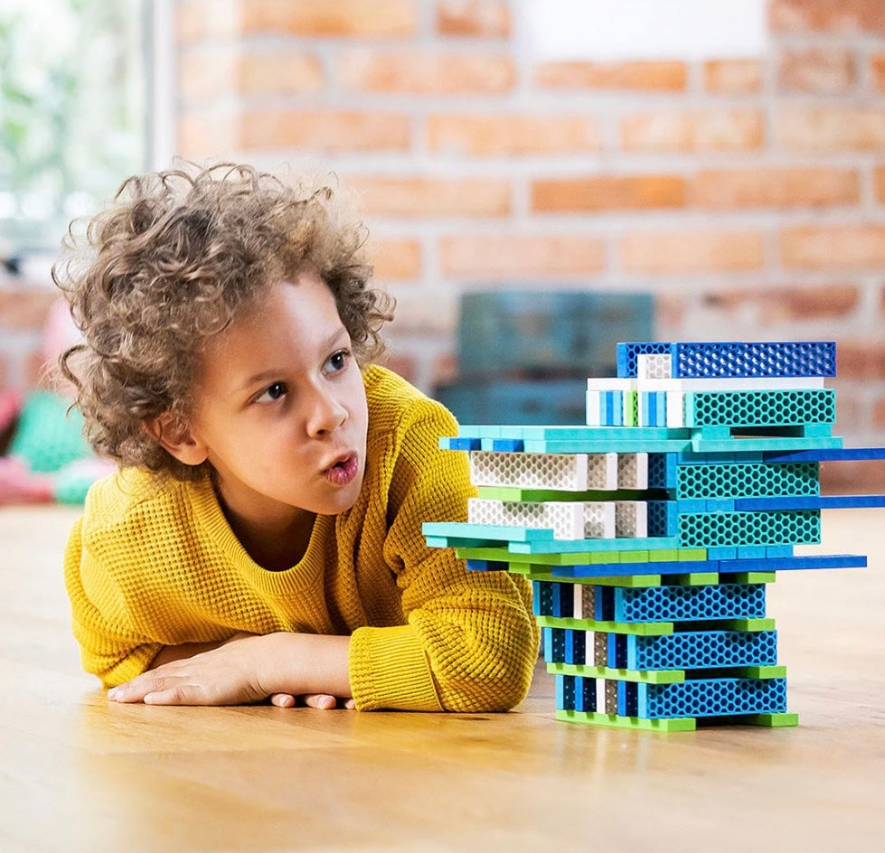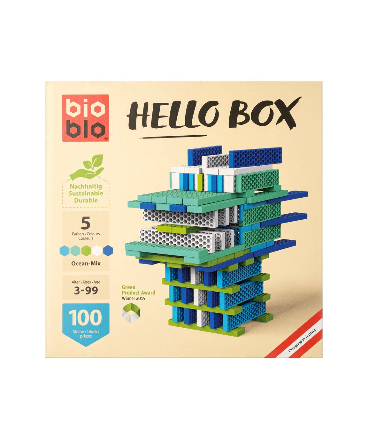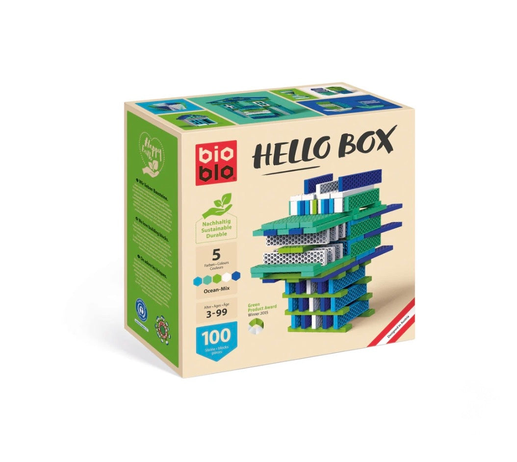 Конструктор Ocean-Mix містить 100 легких і міцних елементів п’яти відтінків. Набір м’яко занурює дитину у світ творчості, будівництва і відкриттів. Поєднання синіх, блакитних, зелених, бірюзових і білих блоків створює природну морську палітру. Текстура, що складається з маленьких комірок і мікроребер, забезпечує хороше зчеплення між елементами, тому конструкції виходять стійкими. Складання башт, укладання елементів, балансування і створення об’ємних форм тренує координацію, точність рухів, відчуття рівноваги і взаємодію обох рук. Конструктор відкриває двері до ранньої математики, розвиває логіку і розуміння послідовностей. Матеріал блоків — екологічний композит із деревної стружки і переробленої сировини. Bioblo — австрійський бренд, який робить акцент на тому, щоб іграшки були безпечними, довговічними і максимально корисними для розвитку дітей.
