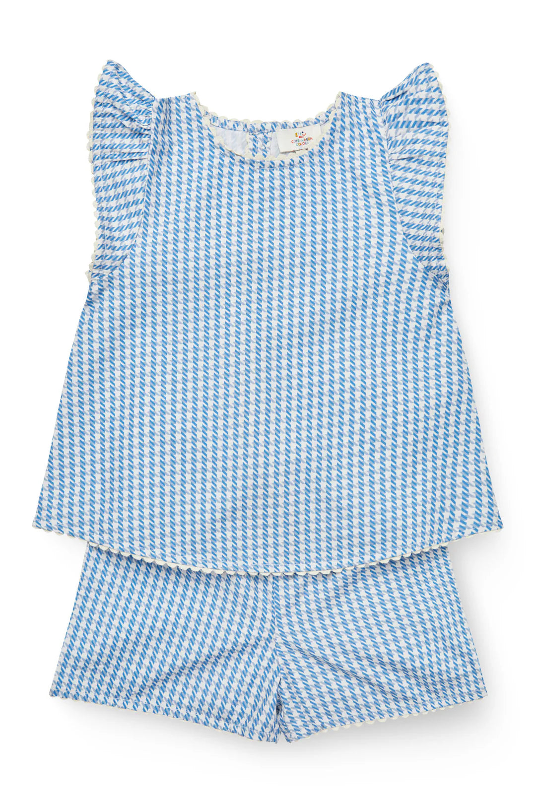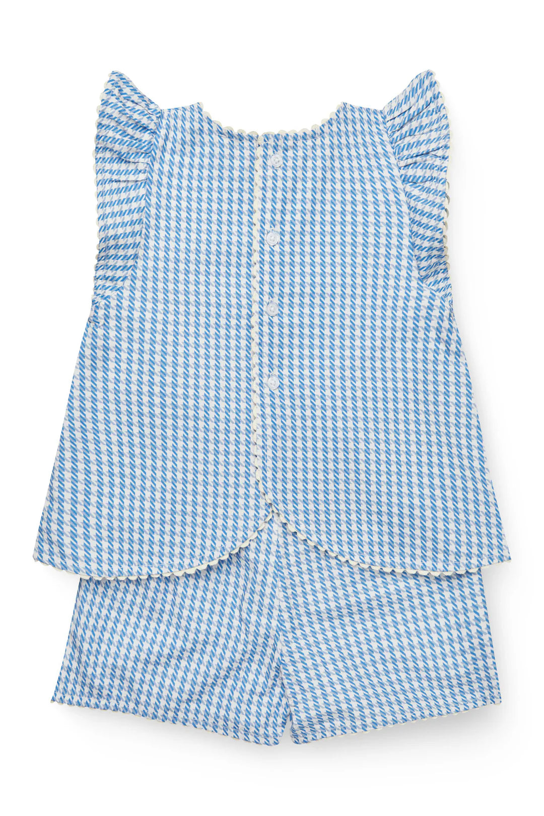 Цей чарівний комплект включає топ без рукавів з ніжними рюшами на плечах та пару шортів у тон, обидва з м'якої тканини з принтом «гусяча лапка». Топ має фестончастий поділ, обтягнуті тканиною ґудзики на спині та милі деталі обробки по краях, що надають йому легкого та грайливого вигляду.