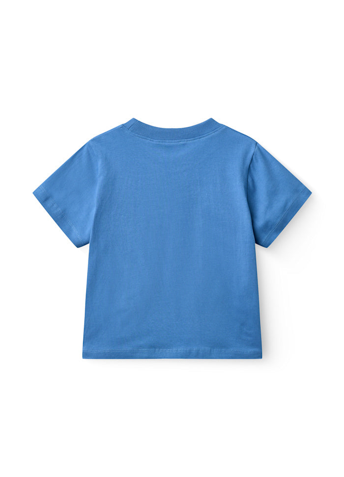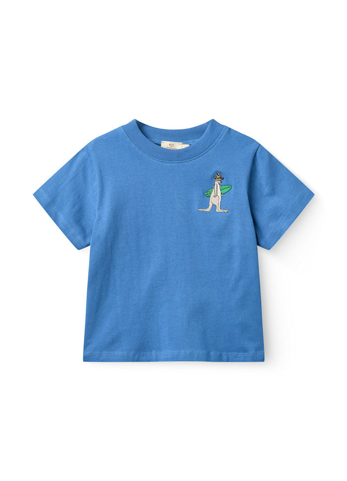 Ця футболка з коротким рукавом має яскравий синій колір і чарівну вишивку кенгуру, що додає веселості та авантюрності повсякденному стилю.