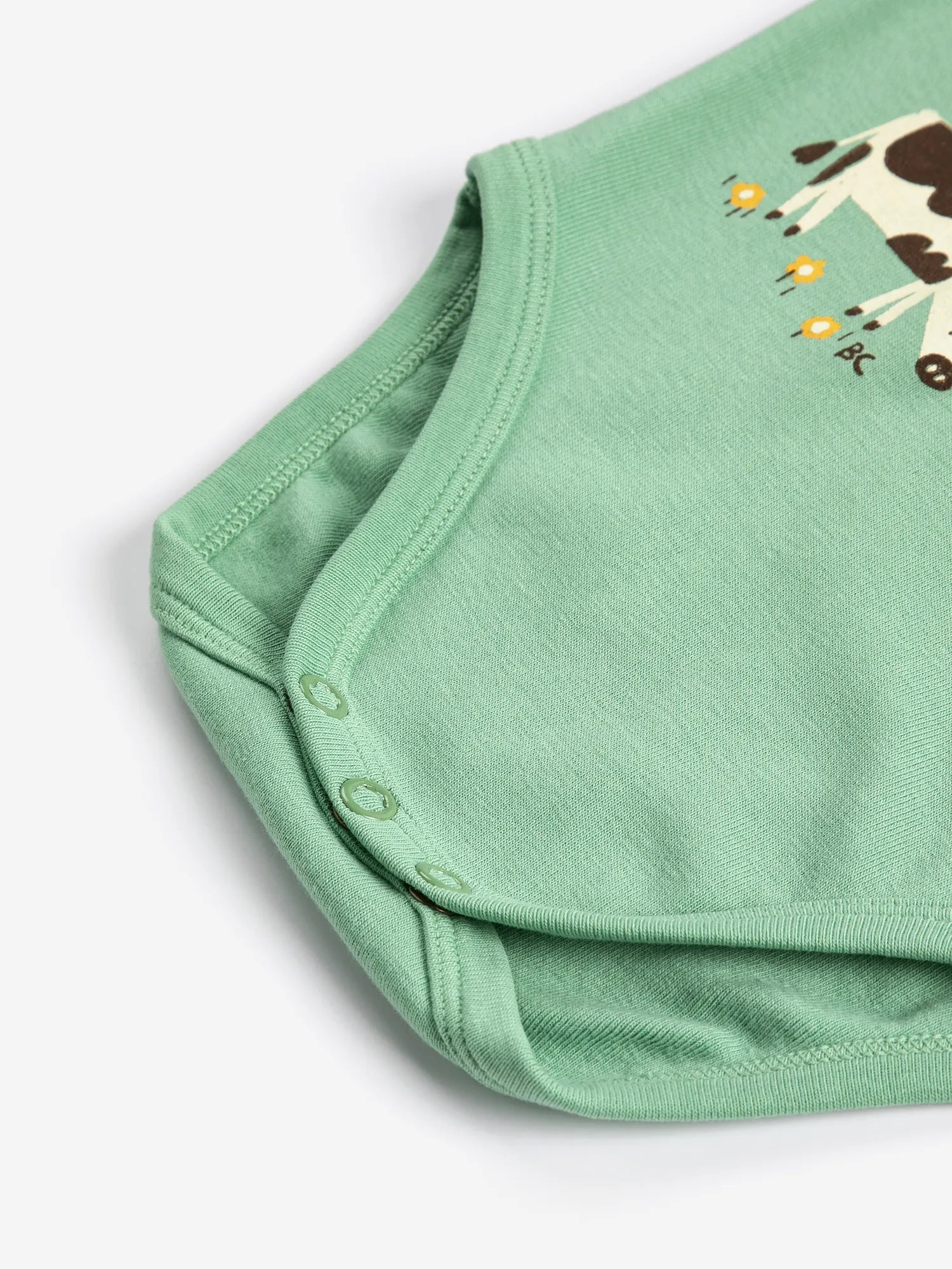 Зелений боді. Короткі рукави, застібка на кнопках на плечах, застібка на кнопках у промежині, приталений крій та круглий виріз горловини. Виготовлено в Іспанії.