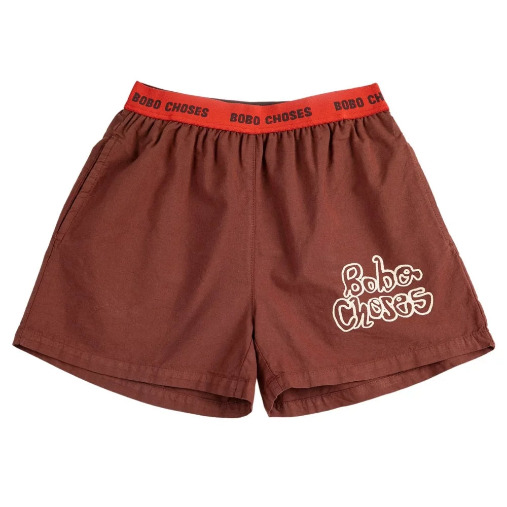 Коричневі шорти з білим логотипом. Дизайн з еластичним поясом, довжиною вище коліна, кишенею на шві та вільним кроєм. Вироблено в Іспанії.