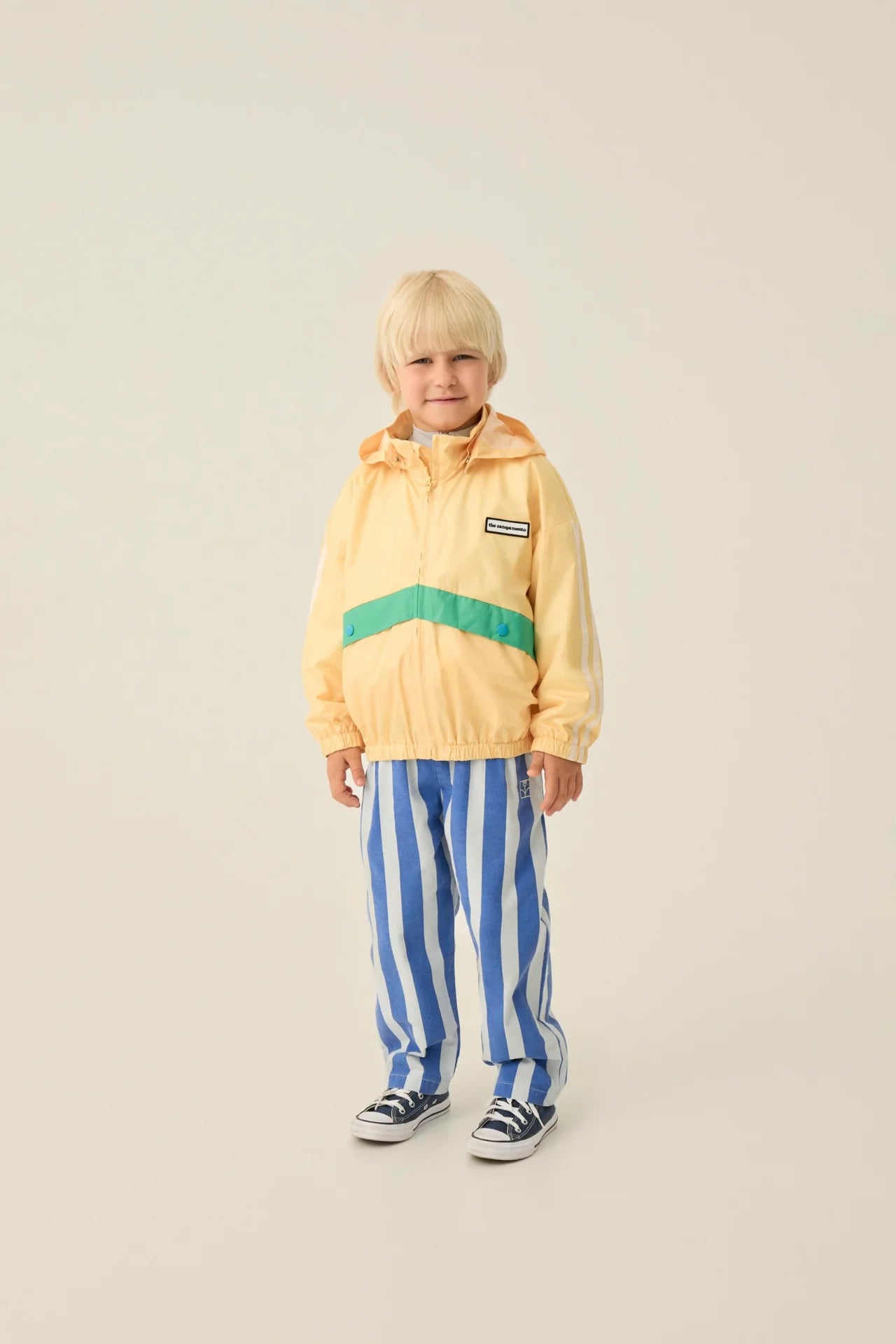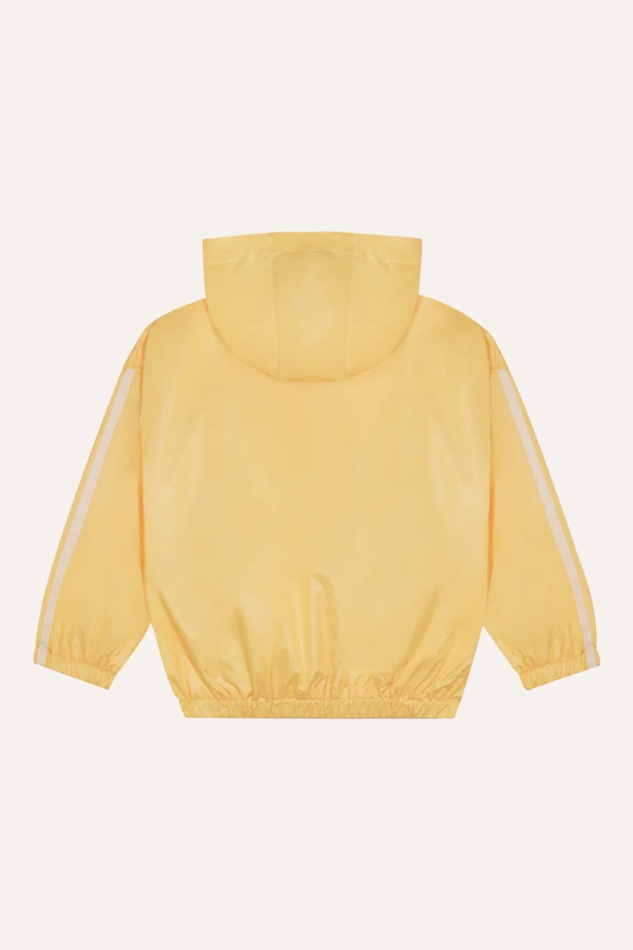 Універсальна куртка, ідеальна для прохолодних літніх днів. Жовтого кольору із зеленими деталями. Виготовлена з переробленого поліестеру та застібається спереду на блискавку. Знімний капюшон.